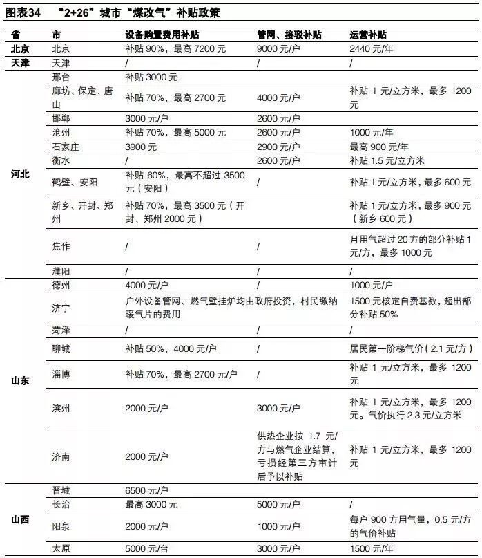 为了推动“煤改气”、”煤改电“,中央政府和地方政府给予大量的财政补贴。